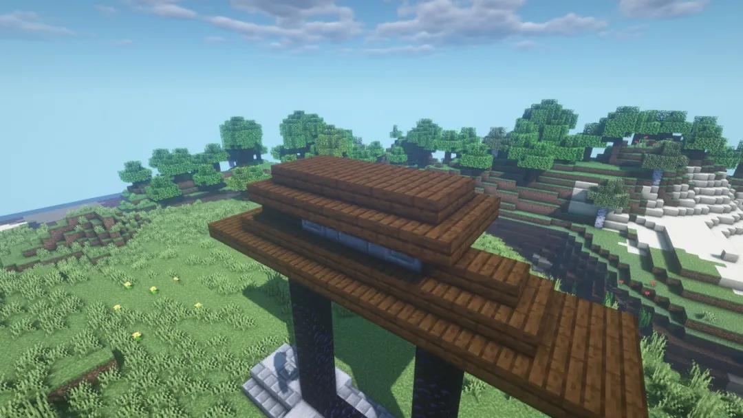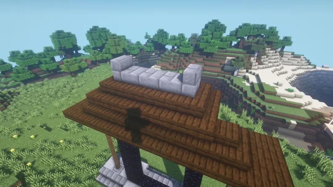 最后在顶上放置两块石砖台阶和两截石砖楼梯,完成屋顶部分。