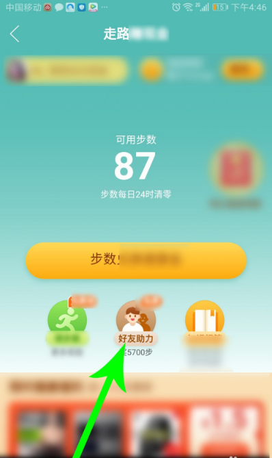 通过走路、答题、好友助力和完成任务获得步数以后,打开走路界面点击“步数兑换健康金”。