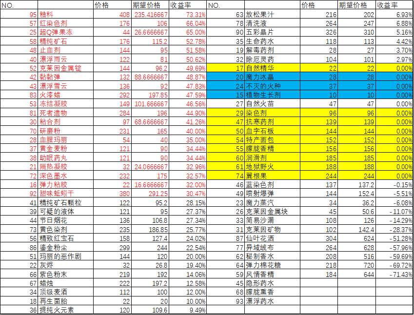 【注】此表以完美方案为准,其他方案会有点失真,不过大体没什么变化。还有就是,价格是1星的价格,3星成品收益率会更高,以及此表仅看净收益率哈,材料获得效率以及售卖效率并没有计算,注意此表收益率并非表示单位时间售卖价格,有些材料可能收益高但是换钱效率低(这个开始没发现,这两天算算看,可能要等会)因此仅供仓库或者部分材料充足的时候参考。