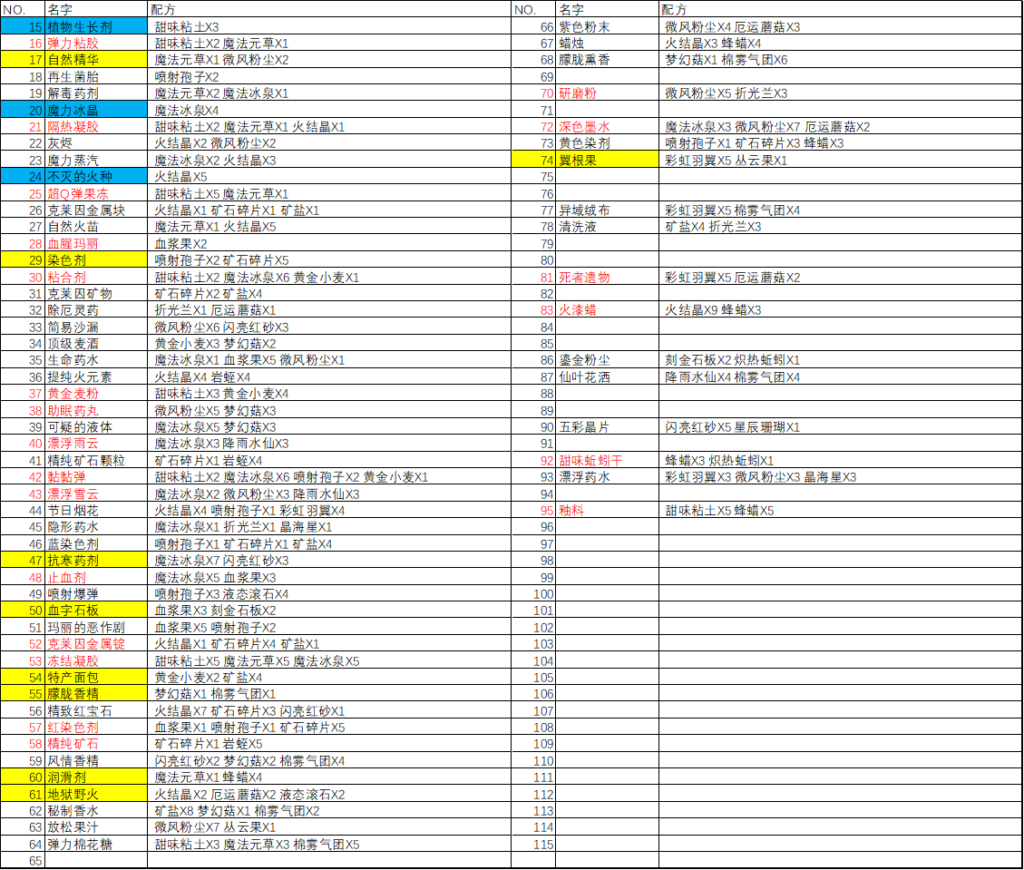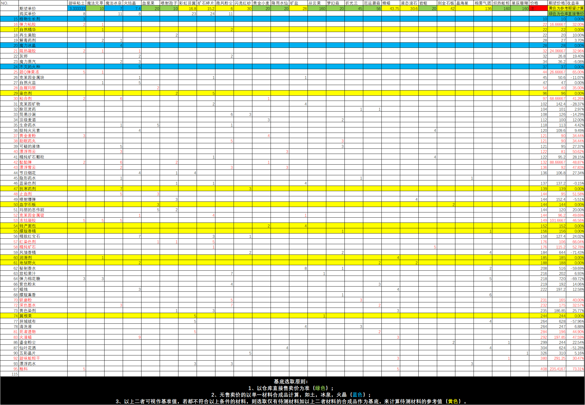 调整了一下参考值。基底选取原则:1、一仓库直接售卖价为准(绿色栏);2、无售卖价的以单一材料合成品计算,如土,冰泉,火晶(蓝色栏);3、以上二者可视作基准值,若都不符合以上条件的材料,则选取仅有待测材料加以上二者材料的合成品作为基底,来计算待测材料的参考值(黄色栏)。