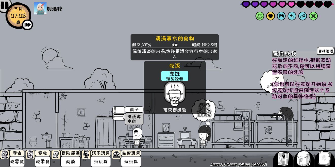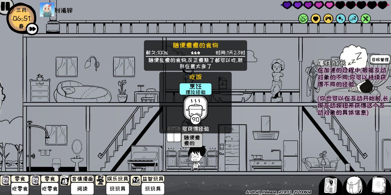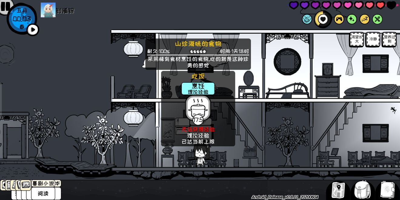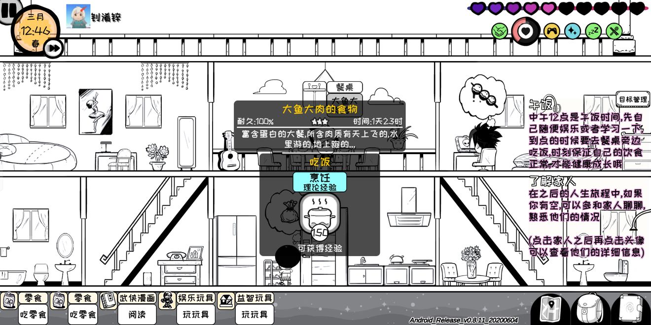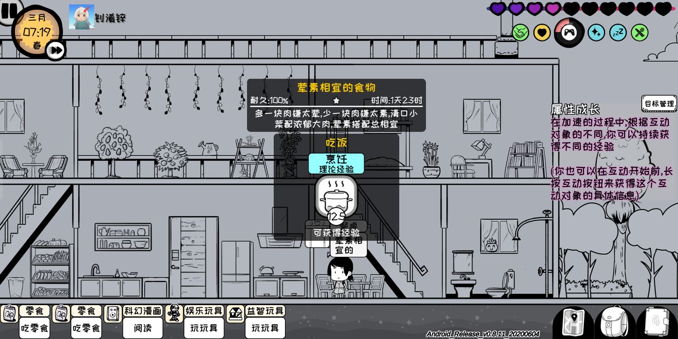 利用餐桌的bug,目前餐桌的机制是一位家长每天6点、12点、18点去灶台做菜,做完后对餐桌执行一次刷新,刷新食物种类、星级和耐久。然而bug在于,如果餐桌上的食物没有吃完,即耐久未降至0,下次刷新仅会重置耐久(这也是为什么山珍海味总是吃不完,因为空腹吃到满也还会剩20%,然后重置)。我们可以在较为集中的一段时间内,通过暴饮暴食的方法刷新餐桌上的食物,直到达到我们想要的荤素相宜,接下来每餐可以在不吃光的情况下随心所欲(注意先消营养过剩debuff)。这种思路的优点是长期稳定,且操作简单。缺点是必须度过一段营养过剩的时期,且刷新食物看脸。
