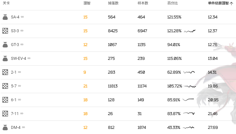 S3-3:异铁掉落效率最高的关卡,同时还有副产物糖,单件异铁掉落期望大概在12.3左右,对于绿色材料来说还算可以接受。