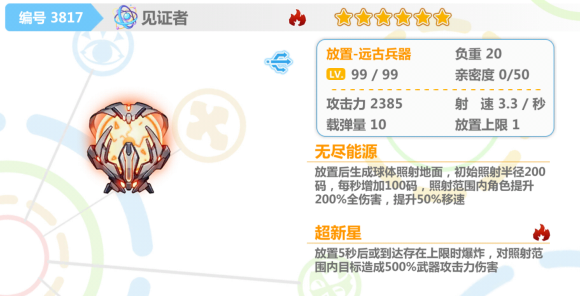 超新星:放置5秒后或到达存在上限时爆炸,对照射范围内目标造成500%武器攻击力伤害