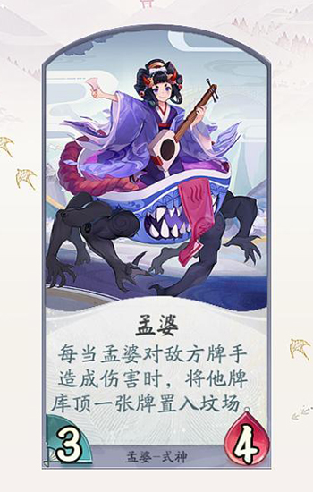 效果:每当孟婆对敌方牌手造成伤害时,将他牌库顶一张牌置入坟场。