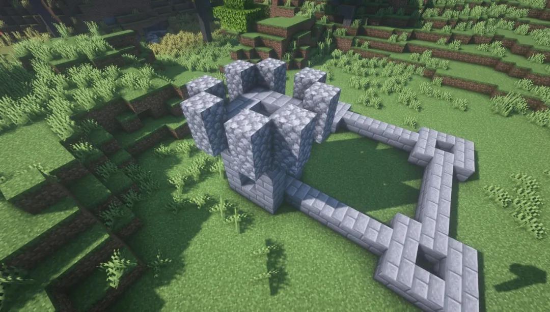 首先用石砖围出四个33的塔楼地基,它们之间空五格,用石砖连起来打上地基。