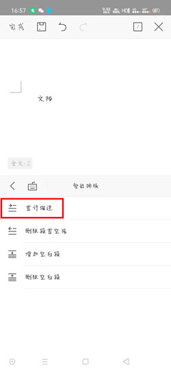 4、选择【首行缩进】功能,可以看到上方的字自动自动首行缩进两个字符了,如果不需要首行缩进,将光标移动至前方,将缩减删除即可。(注意:首行缩进未删除保存之后,每个段落都会执行首行缩进)