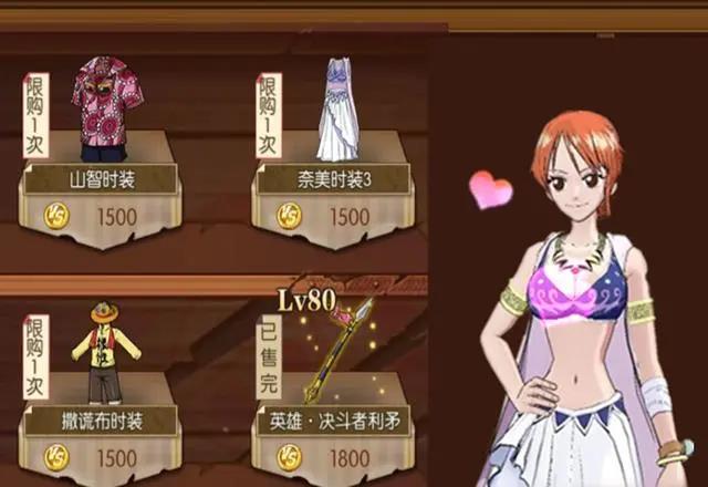 时装的话,除非是自己喜欢的,不然这次就算了吧。都是SR的时装,基本上是没什么实用价值的,就只能拿出来站街。SR娜美的那个阿拉巴斯坦的时装,当初有过一波免费的票选活动,但最后莫名其妙的是路飞时装得票最多。这次如果想要的话,其实也能够入手的。
