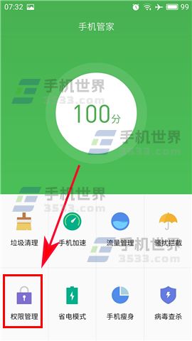 1)打开自带应用【手机管家】,打开以后点击【权限管理】。(如下图)