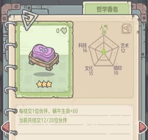 这个充满“哲学”气息的香皂仅需36K黑蝌蚪就可以入手,属性每结交一个伙伴,生命+60,最高20个伙伴。