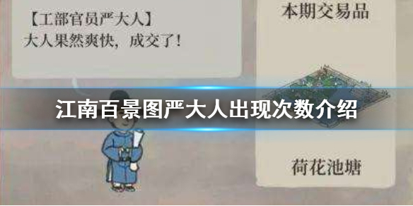 江南百景图严大人多长时间出现一次?玩家可以去严大人那兑换物品,有些非常有价值,那么严大人多久来一次呢,小编给大家带来了江南百景图严大人出现次数介绍,一起来看看吧。
