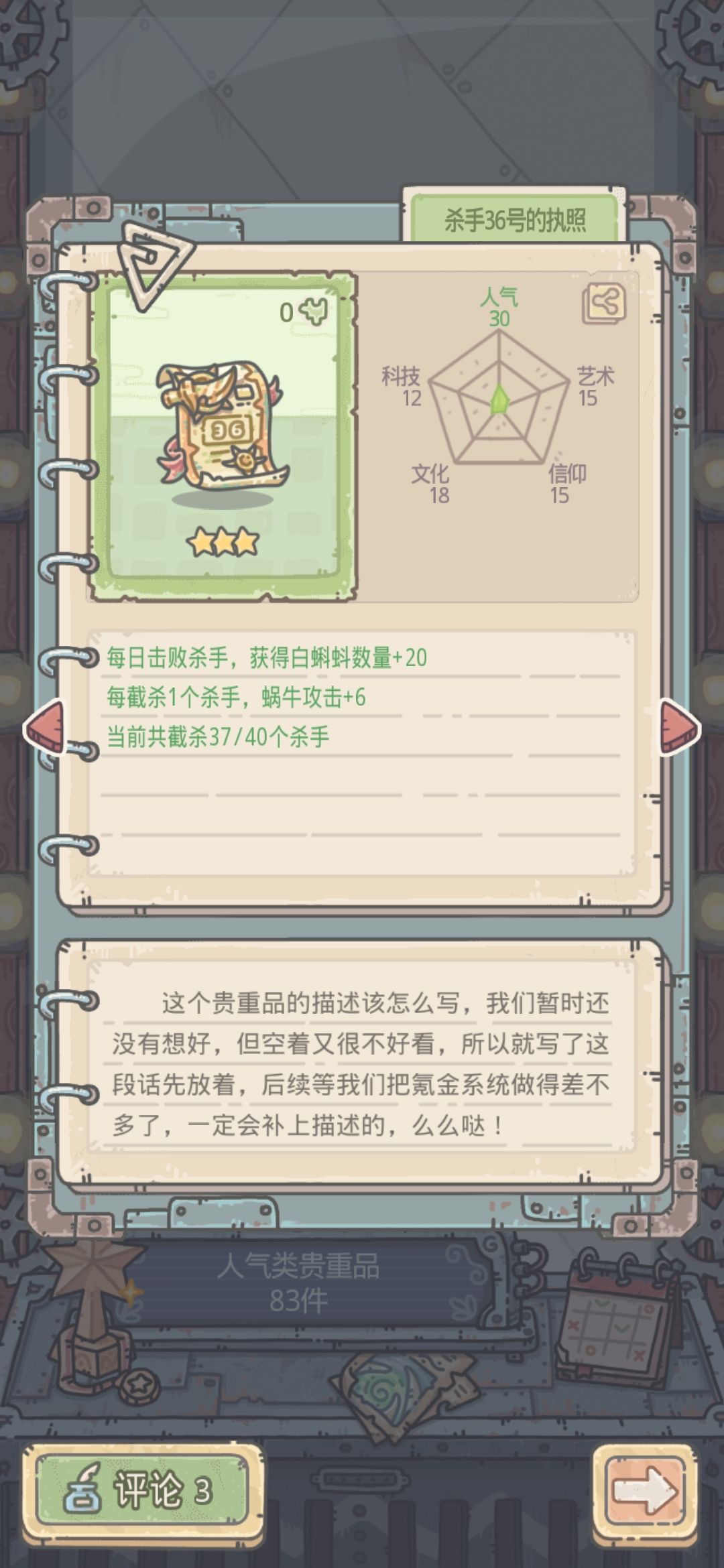 效果:每日击败杀手,获得白蝌蚪数量+15。每截杀一个杀手,蜗牛防御+6、0/40