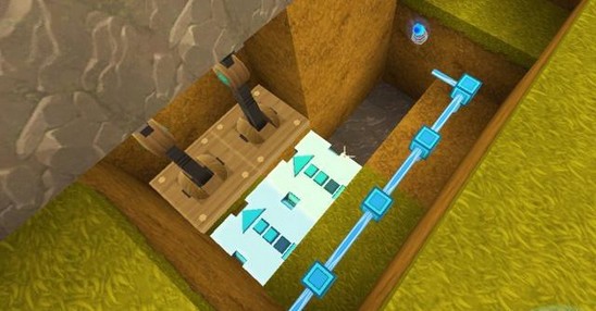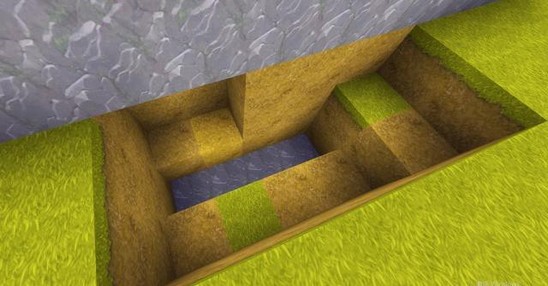首先,在隐藏床的墙壁外边挖一个深度为3格的坑,用于放置电路,坑的具体挖法如图。