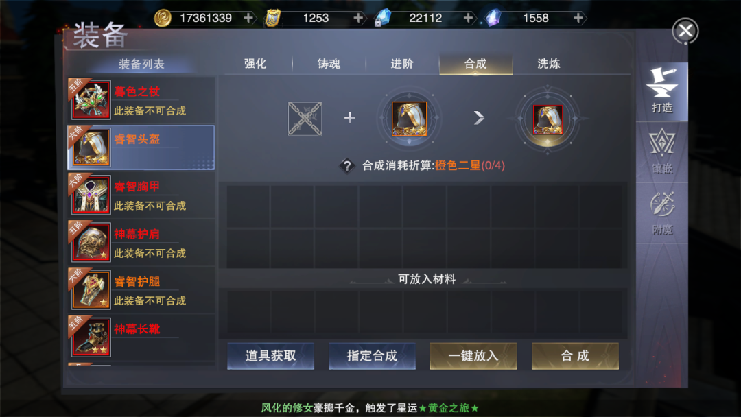 相比强化和铸魂,装备合成的门槛比较高,但是合成装备可以飞速提升战斗力。