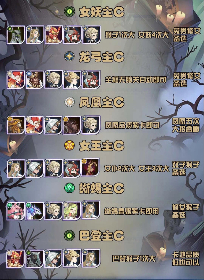 根据自身卡池选择,思路就是可上两个输出,己方至多释放5次必杀技,诸多工具人紫卡即用,此次BOSS难度不高,尽量打满。