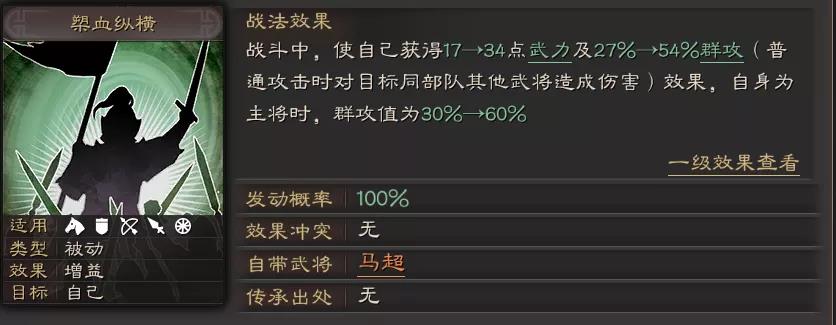 在属性上,马超毫无疑问拥有最顶级的武力初始值和武力成长。智力成长不错但初始值太低,这也是大部武将的通病,满级都不过百,难受。统率也偏低,但胜在初始值不错。速度双高,但因为马超是输出武将,在当前版本中很难拿到先手优势。