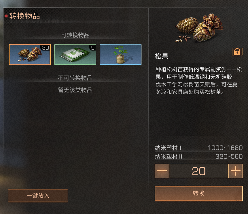 其中松果便是转换为纳米塑材的绝佳原材料之一,只需要在塑材转换机里投入相应的资源和木材,便可获得各等级的纳米塑材啦。