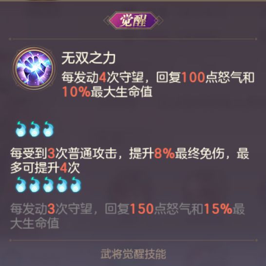 五星的徐晃可以在自身攻击之后,获得免伤buff的加成,提高了徐晃自身的坦度,并且徐晃的大招有概率降低敌方全体怒气。无双之后的徐晃更是可以将敌方的怒气恢复降低30%,因此三号位的徐晃刚好可以进行中场阶段的怒气压制。