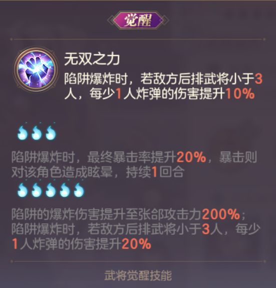 配上副属性加暴击率的战魂更是妙上加妙,4号位张郃的【陷阱】是一回合后爆炸。所以放在4号位可以更快进行【陷阱】的布置,能在保证安全的同时进行输出。