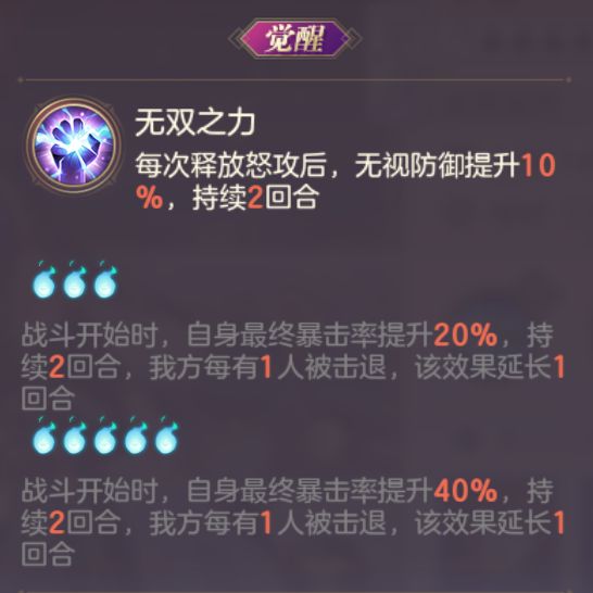 【魏之乱武】更能使王阿姨自身的伤害增加并提升魏国武将的最终免伤,自身所携带无视防御的特性能进行战场收割。【复仇】【无双之力】有着在绝境中翻盘的机会,放在6号位,是每一回合的结尾,能够更及时触发【复仇】特性。