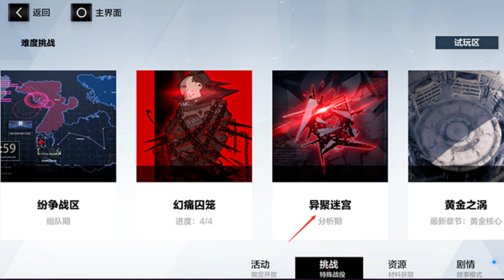 方法一:指挥官可以通过主界面【战斗】【挑战】【异聚迷宫】 进入。