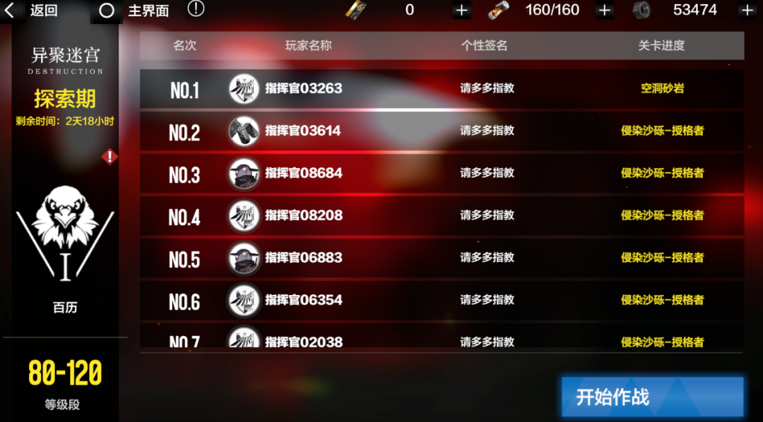 (2)、指挥官可在首页查看本期活动中自己与其他指挥官的排名和关卡攻略进度。