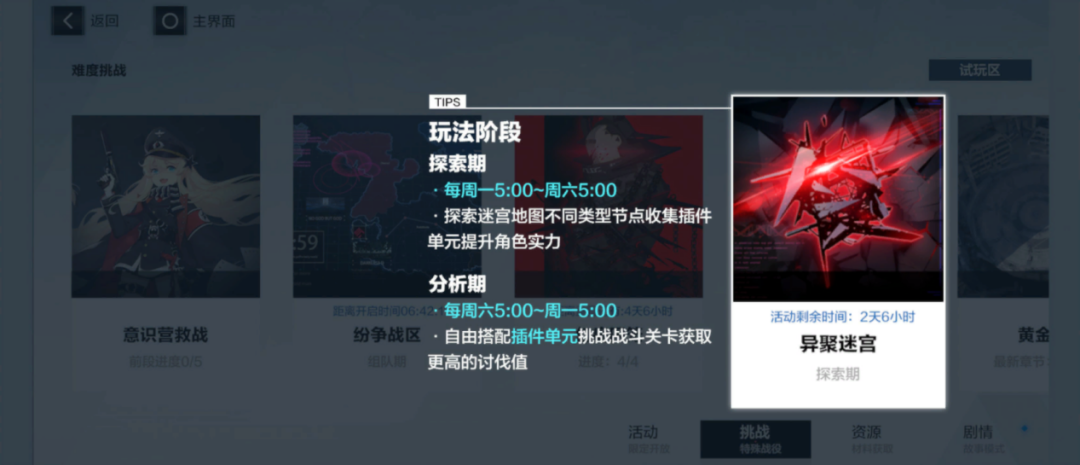(2)、第一阶段为探索期,探索期包含数个区域,指挥官可以通过探索各个区域收集插件单元(仅异聚迷宫玩法生效)来提升小队实力。