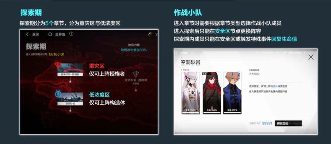 (1)、探索期中含有多个区域,分为重灾区和低浓度区。作战小队进入章节时需要根据章节类型选择作战小队成员,进入探索后只能在安全区节点更换阵容,探索期内成员只能在安全区或触发特殊事件回复生命值。