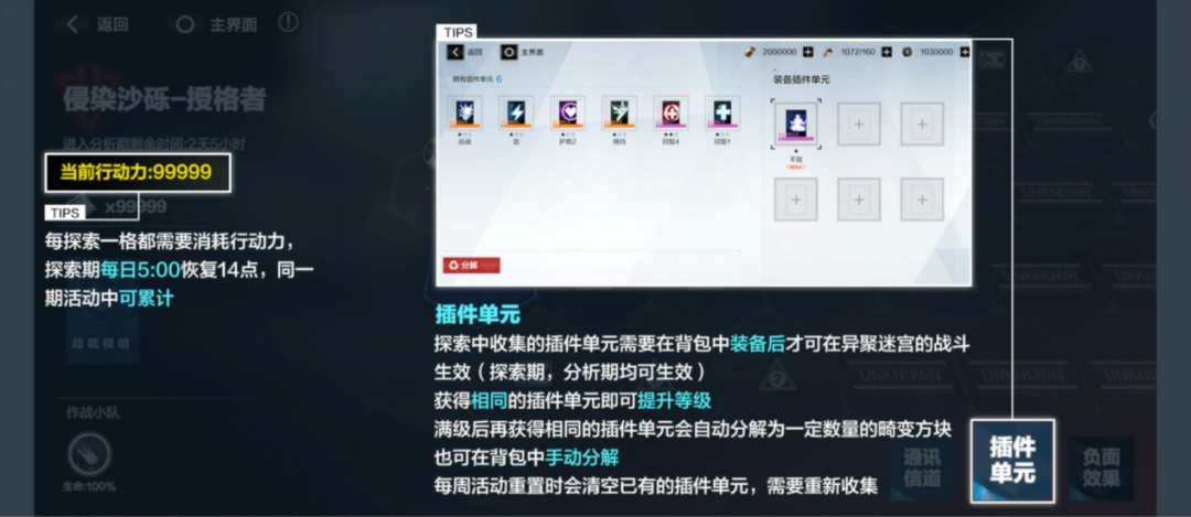 (1)、分析期指挥官可通过自由搭配拥有的插件单元,进行关卡挑战,争取获得更高的讨伐值。