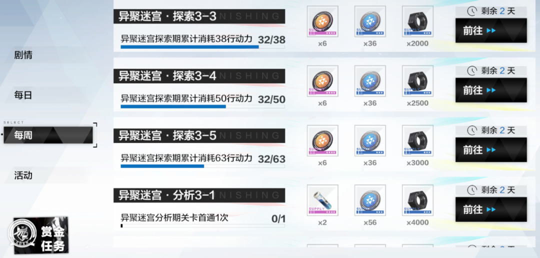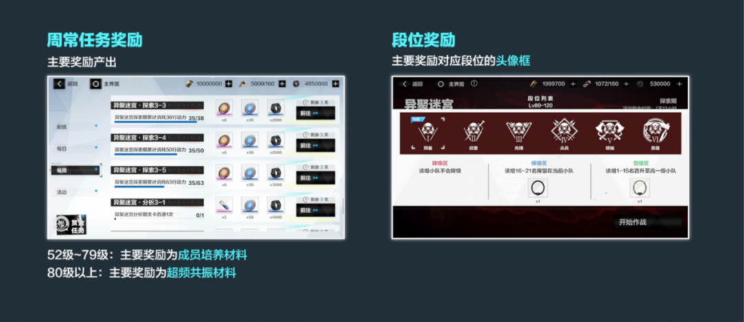 2、周常任务奖励中,不同等级段位的指挥官获得的主要奖励不同,52级-79级的指挥官周常任务奖励主要为成员培养材料,80级以上的指挥官周常任务奖励主要为超频共振材料;