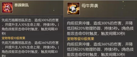 可以通过两张图对比,主动技能效果分为两种,一种是为主人自身提高属性,一种是目标debuff(减益效果)。这里推荐是主要输出职业带上为自身提高攻击的宠物。其他职业带上目标debuff。目标debuff就相当于一次全队增益(BOSS减少防御全队输出提升)。当然主动技能的伤害是由宠物品质决定的。