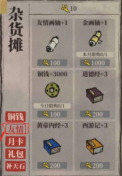 此时便可以进入商店,在左下角可以看到友情选项,点进去就可以进入友情商店兑换物品了。
