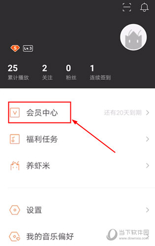 1、打开虾米音乐,点击界面下方个人中心图标,在弹出的界面中,点击界面中间的会员中心图标。