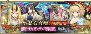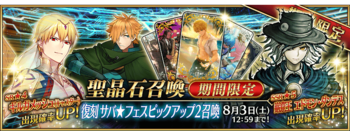 此外还有今年的福袋卡池为上(上3骑+仇尺降月)下(下4骑+丑)全限定池,使用15个付费圣晶石可以获得一次抽卡机会,必定至少获得一骑五星从者。
