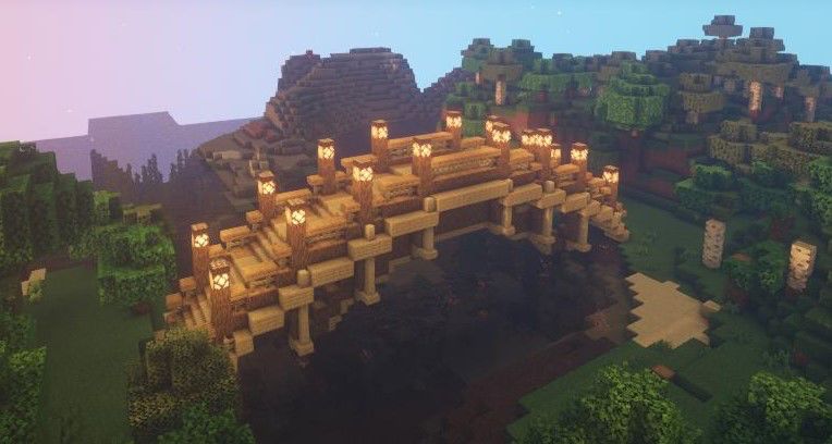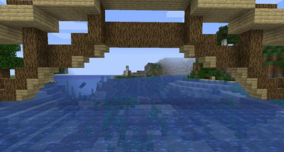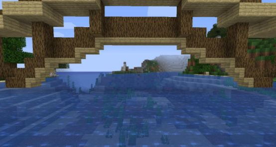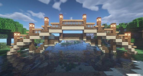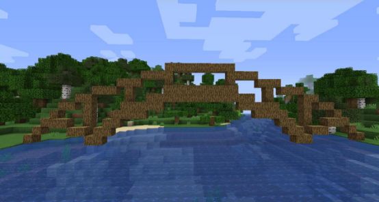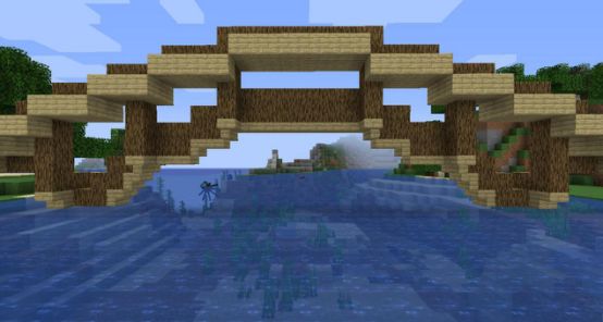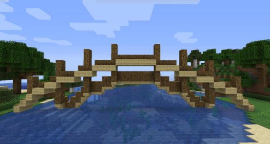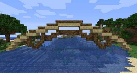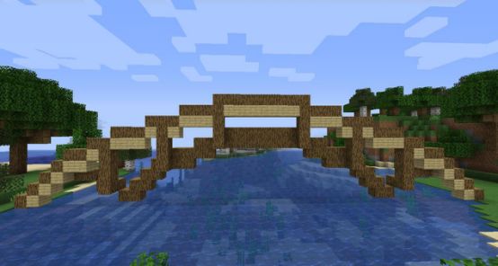 首先用橡木圆木搭出桥的框架(整个框架的长度为43,要找到合适宽度的河流哦)