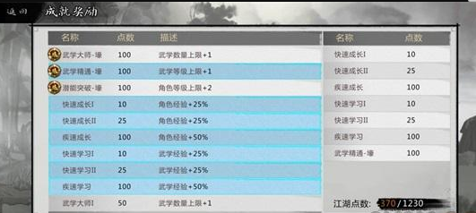 首先我们将人物经验和武学经验加成学满,之后再把武学等级学三级,也就是50,100,200。此外豪侠武学等级学一级。之后人物等级加2学一级,50点数的初始好感度学了(就是最下面一个),基本就算完成了。