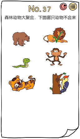 脑洞大神第37关怎么通关?许多同学都不清楚,游戏中大量原创谜题,答题消耗体力,体力需要通关时间恢复,这款脑洞游戏和好玩关键是不会弹广告,闲散时间玩一玩挺合适的,大量的关卡等你来挑战,难度越来越大,非常具有挑战性,那么快和小编一起来看看这篇下面哪只动物不会来通关步骤一览,相信能帮助大家了解。