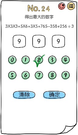 脑洞大神第24关怎么通关?玩家们都在寻找这个问题的答案,游戏中大量原创谜题,答题消耗体力,体力需要通关时间恢复,这款脑洞游戏和好玩关键是不会弹广告,闲散时间玩一玩挺合适的,大量的关卡等你来挑战,难度越来越大,非常具有挑战性,那么快和小编一起来看看这篇得出最大的数字通关步骤一览,相信能帮助大家了解。