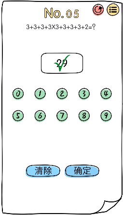 脑洞大神第5关怎么通关?玩家们都在寻找这个问题的答案,游戏中大量原创谜题,答题消耗体力,体力需要通关时间恢复,这款脑洞游戏和好玩关键是不会弹广告,闲散时间玩一玩挺合适的,大量的关卡等你来挑战,难度越来越大,非常具有挑战性,那么快和小编一起来看看这篇3+3+3+3*3+3+3+3+2=通关步骤一览,相信能够帮助到有需要的玩家。