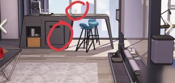 图一,高脚凳旁边的被子,高脚凳旁边的储物柜;