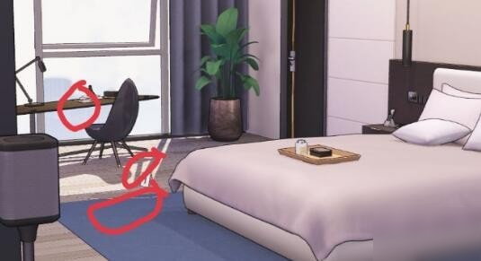 图三,卧室书桌上的摆件,卧室书桌椅子旁地板上的划痕,卧室地摊上的印记。