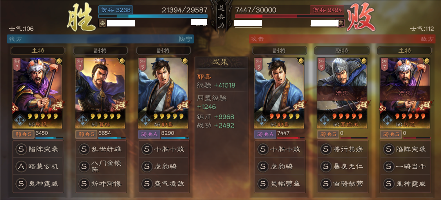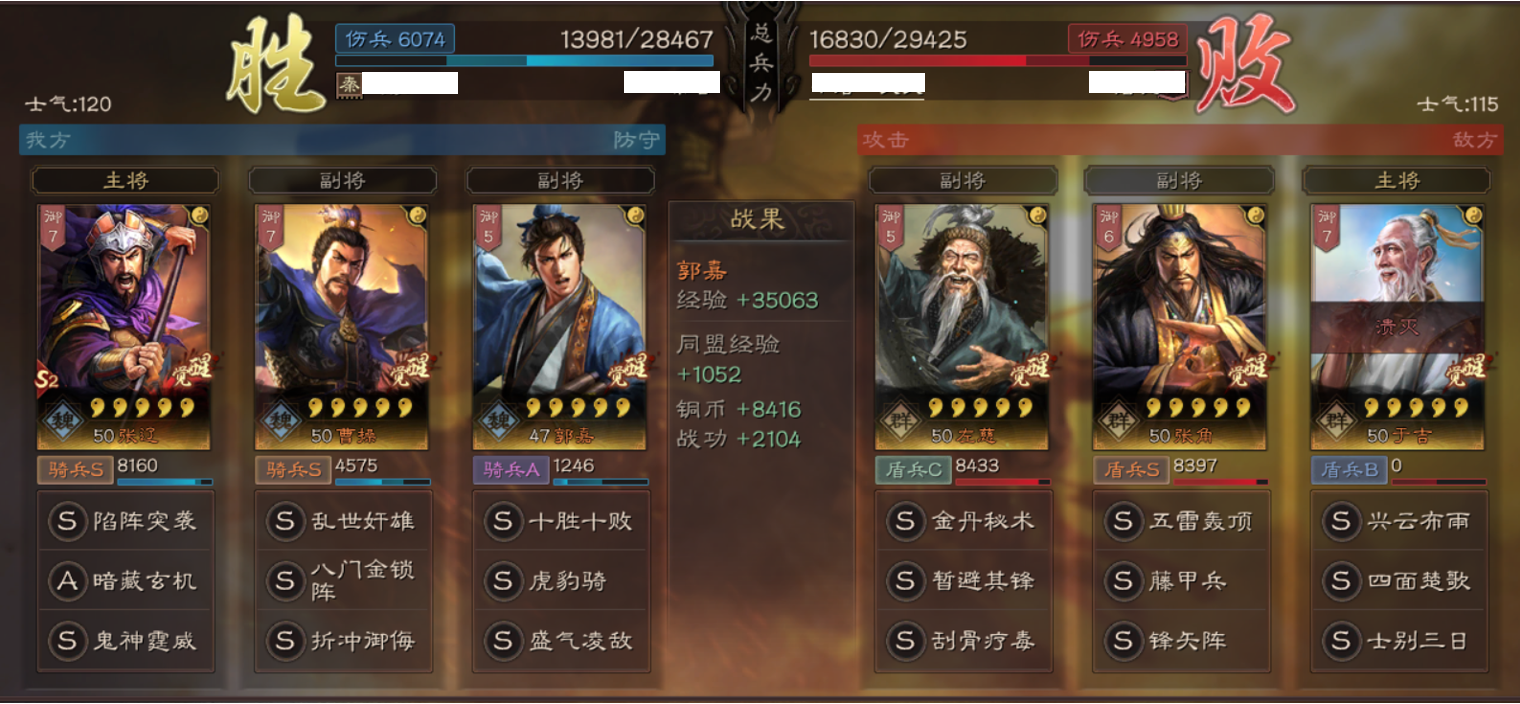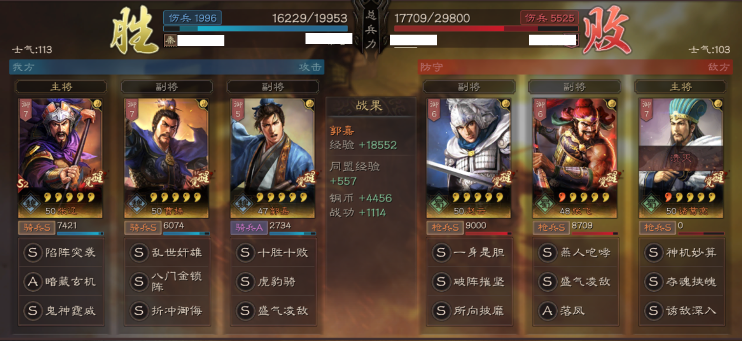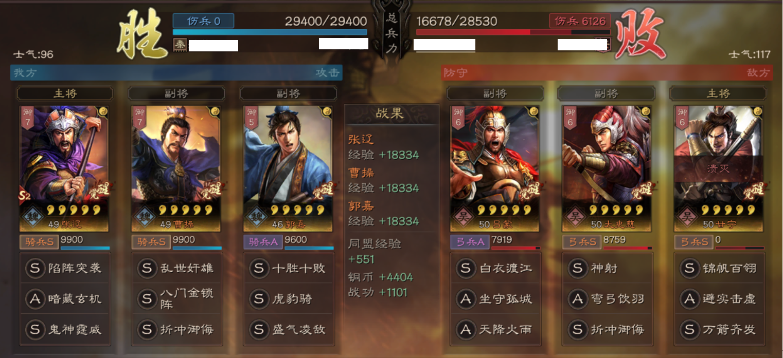 这里重点说明一下为什么带盛气凌敌,主要用来针对S2中两种队伍,一是带折冲的太史慈用来破防护主队伍,主流代表:甘宁、太史慈、程普;二是针对以突击技能为主的队伍,主流代表:张辽、夏侯渊双核突击爆头阵容。兵书诱敌、励军,最大化张辽的输出加成。郭嘉在这里主要承担工具人的角色,所有战法都不吃属性加成,全统率加点提高生存能力。