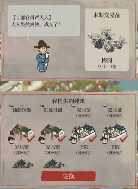 小技巧:有江湖消息称,严大人在多年的买卖生涯中,形成了自己独有的一套价值交换体系。(以告示牌为例,在严大人的眼中,价值为1,竹林花园价值为150,虽然严大人对于告示牌很是不屑,但如果我们凑够150个告示牌也不是不能商量的)。