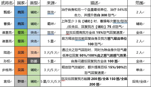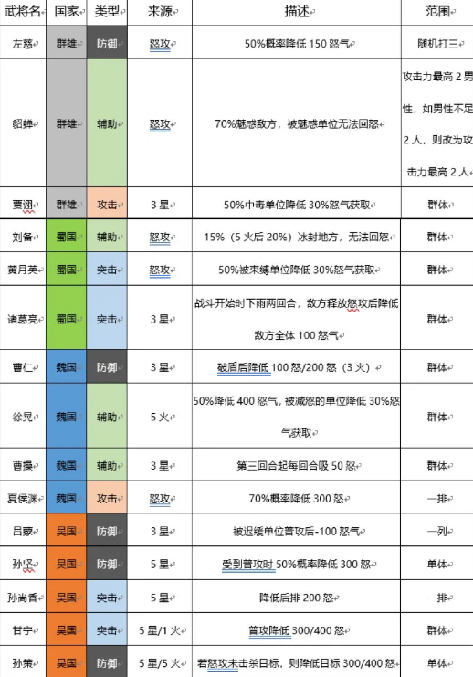 为了方便大家组建阵容,我对一些拥有特定效果的武将,进行了整理,希望能够给予大家一些启发,详见如下: