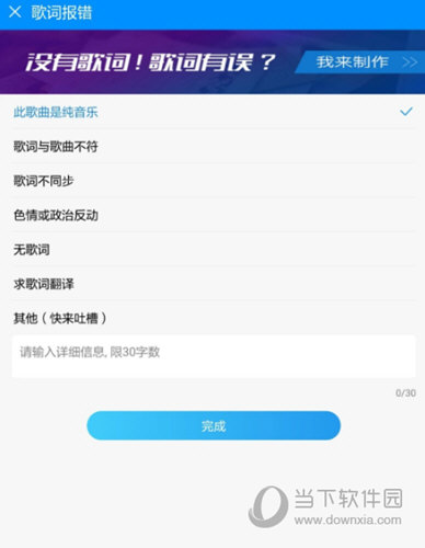 2、最后,你可以根据实际情况选择歌曲歌词错误的原因,再在下方的输入框中输入你歌词有误的详细信息,点击完成即可完成歌词报错。