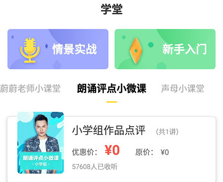 1、 首先打开诵读帮APP,进入软件之后通过底部菜单栏进入学堂页面,在当前页面中可以找到各种小课堂;