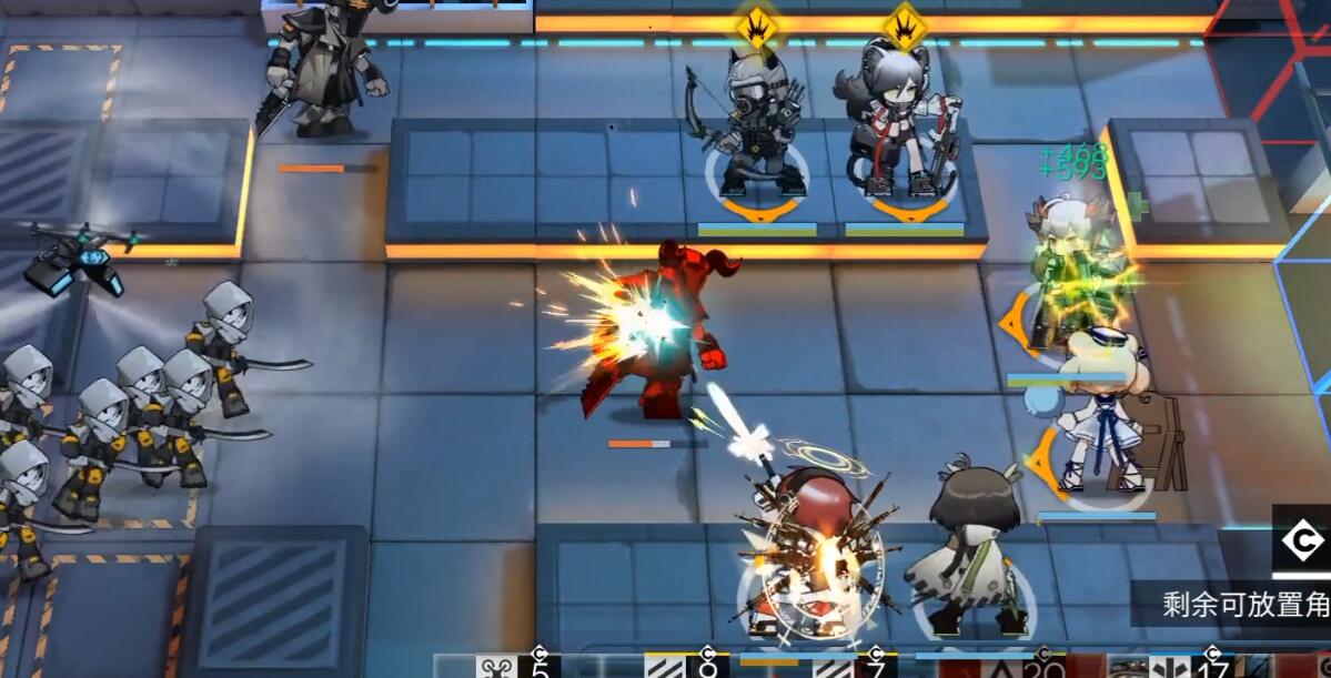 如果有夜莺+角峰满级搭配,可以尝试吃紫箭,不过还是不推荐,万一暴毙了那就不好处理了,因为这关除去BOSS之外小怪也是非常多的,重装一倒,没有档二以上干员补上的话很难可以挡住怪物,当然输出高除外。
