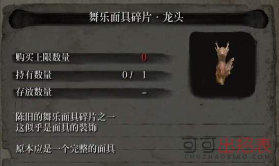 【龙之舞乐面具】分为右面、龙头、左面共3个碎片,都是从商人处购买获得的。左右两面需要花费宝鲤之鳞从【坛子贵人】处购买(总共需要消耗19个宝鲤之鳞),龙头则需要花费5000金币购买。