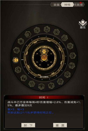 在完成某些事件后,会自动获得神石。比如说将任意技能等级提升到10级后,会得到战斗之石;拥有两件金色传奇或以上的装备时,会得到日耀之石。当得到神格外圈的所有神石后,会触发神格觉醒。觉醒时不但自身的属性会获得大幅度提升,而且还会得到一枚可装备的神石,随着时间的推移,玩家们每到壮年,消耗遗忘之魂后还可进行重生,每次重生会获得一个神格,可进行多次重生。装备很重要