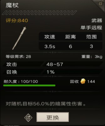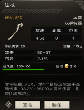 与其他部位的装备不同,在“武器”类装备的评分下方,会有一些其它的属性。如图所示,在武器图标右侧,共有“攻速”“距离”和“范围”三个额外属性。无论是怎样的武器,都会固定有这三种属性,因此只要充分了解每个属性,就可以点带面,了解所有武器。