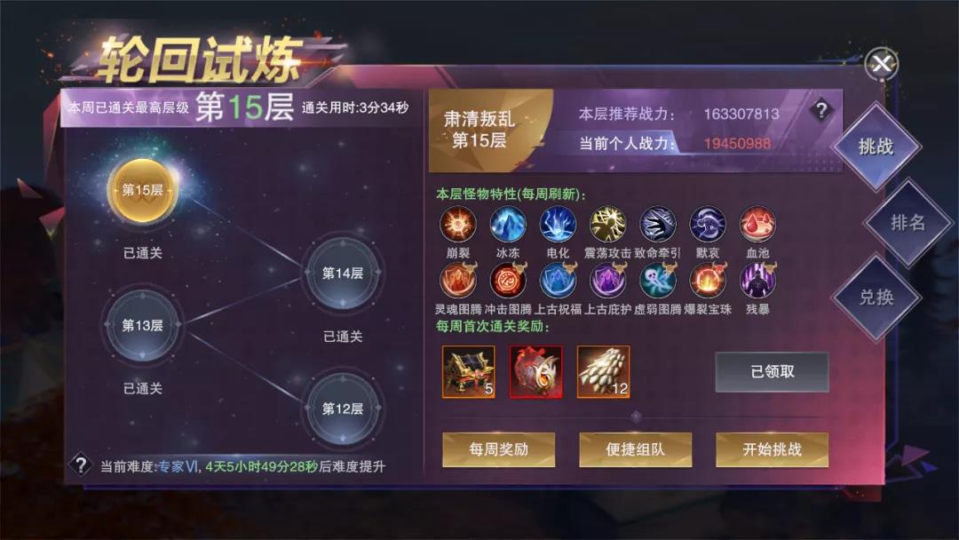 当各位勇士达到125级,可1-5人组队挑战轮回试炼。